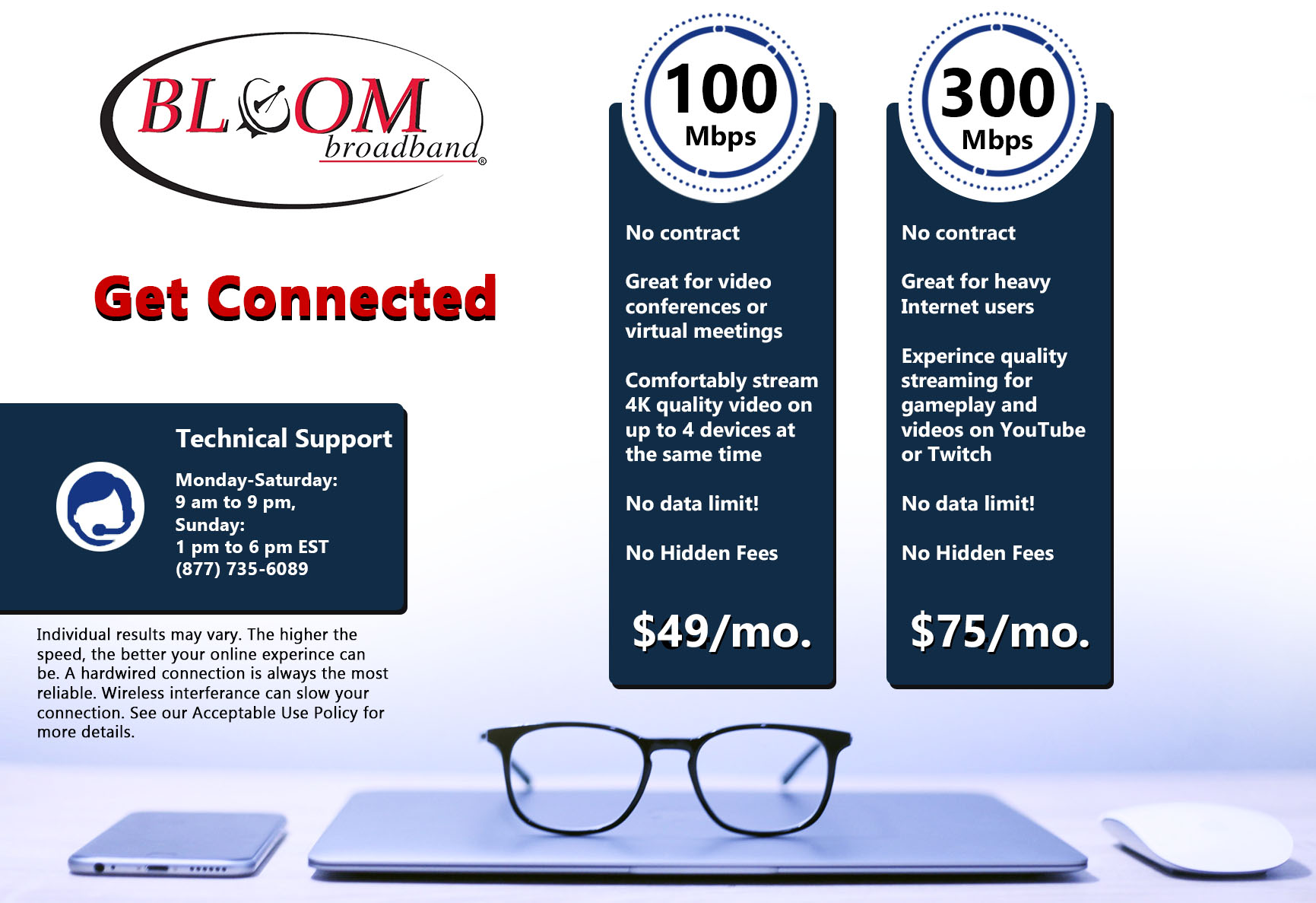 Our Bloom Support Call Center is located in Michigan and staffed with well trained and kind individuals who are experienced in providing support for our Subscribers.  If you ever have a problem with your Bloom Internet Service, they're the ones to call!  Bloom Broadband has response times to service tickets that are well above industry standards.  We are committed in providing reliable service for all our Subscribers.